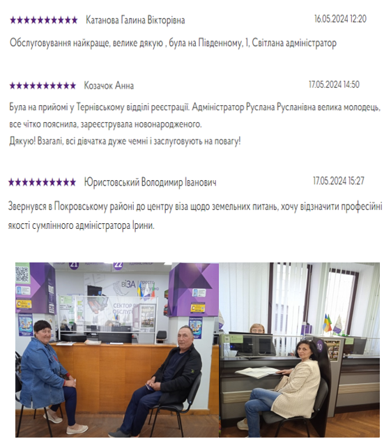 У житті часто буває, коли нам потрібна підтримка та допомога, тому важливо вміти висловлювати вдячність та турботу. «Дякуємо» – важливе, тепле слово, що йде від сердця кожного співробітника Центру «Віза»! Ми дуже вдячні за те, що Ви довіряєте, обираєте та рекомендуєте саме нас! Адміністратори Центру адміністративних послуг «Віза» («Центр Дії»), щодня намагаються ділитися своїм позитивом та дарувати посмішки кожному замовнику послуг і ми дуже радіємо, коли отримуємо взаємну відповідь та схвальні відгуки щодо нашої роботи.